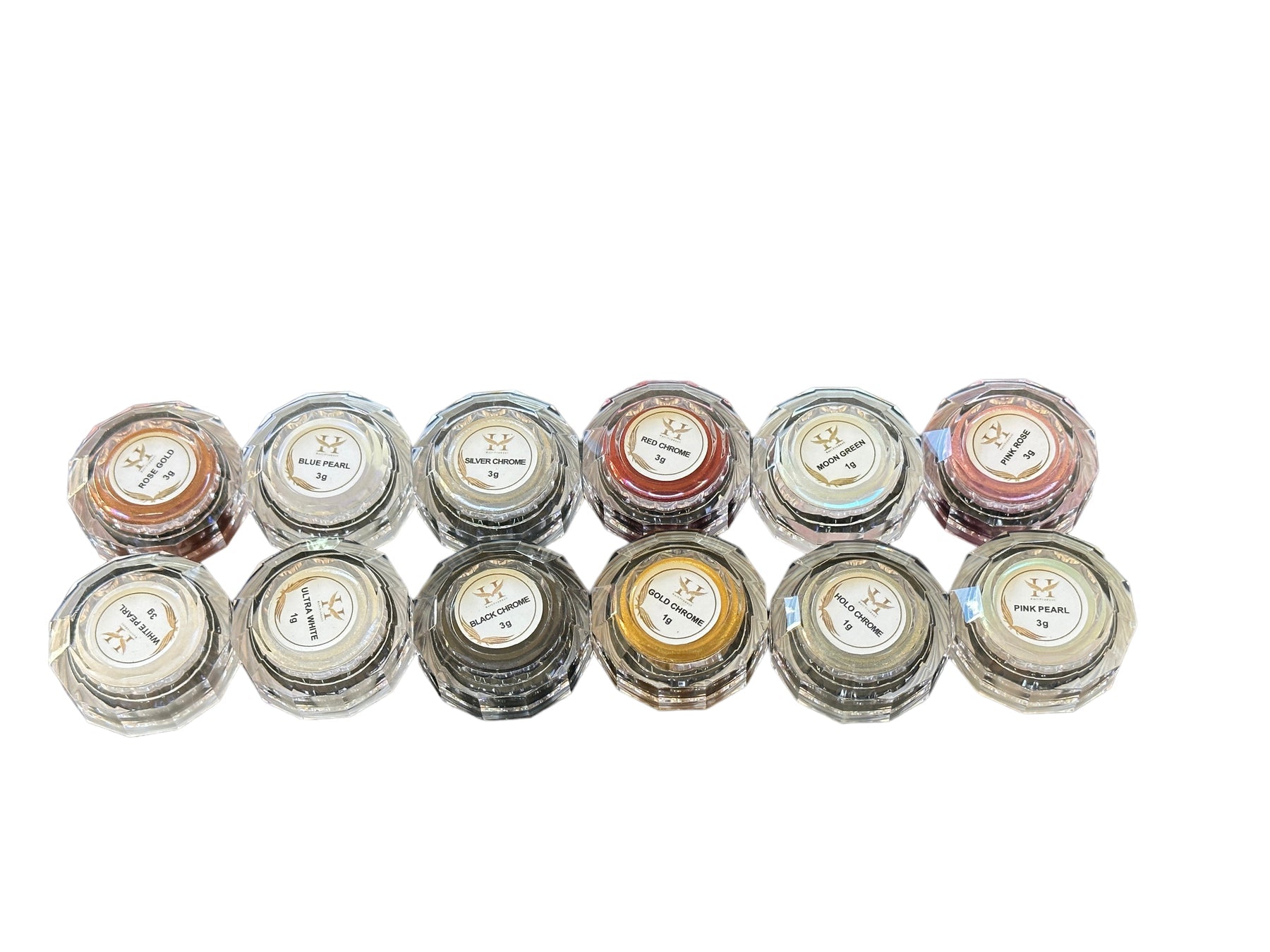 12 Colors Chrome Set 1 by Hang is a professional chrome powder collection featuring 12 stunning shades designed to create mirror, pearl, holographic, and metallic nail effects. This set includes a FREE color chart sample (#1–#12) for easy shade selection and client display.